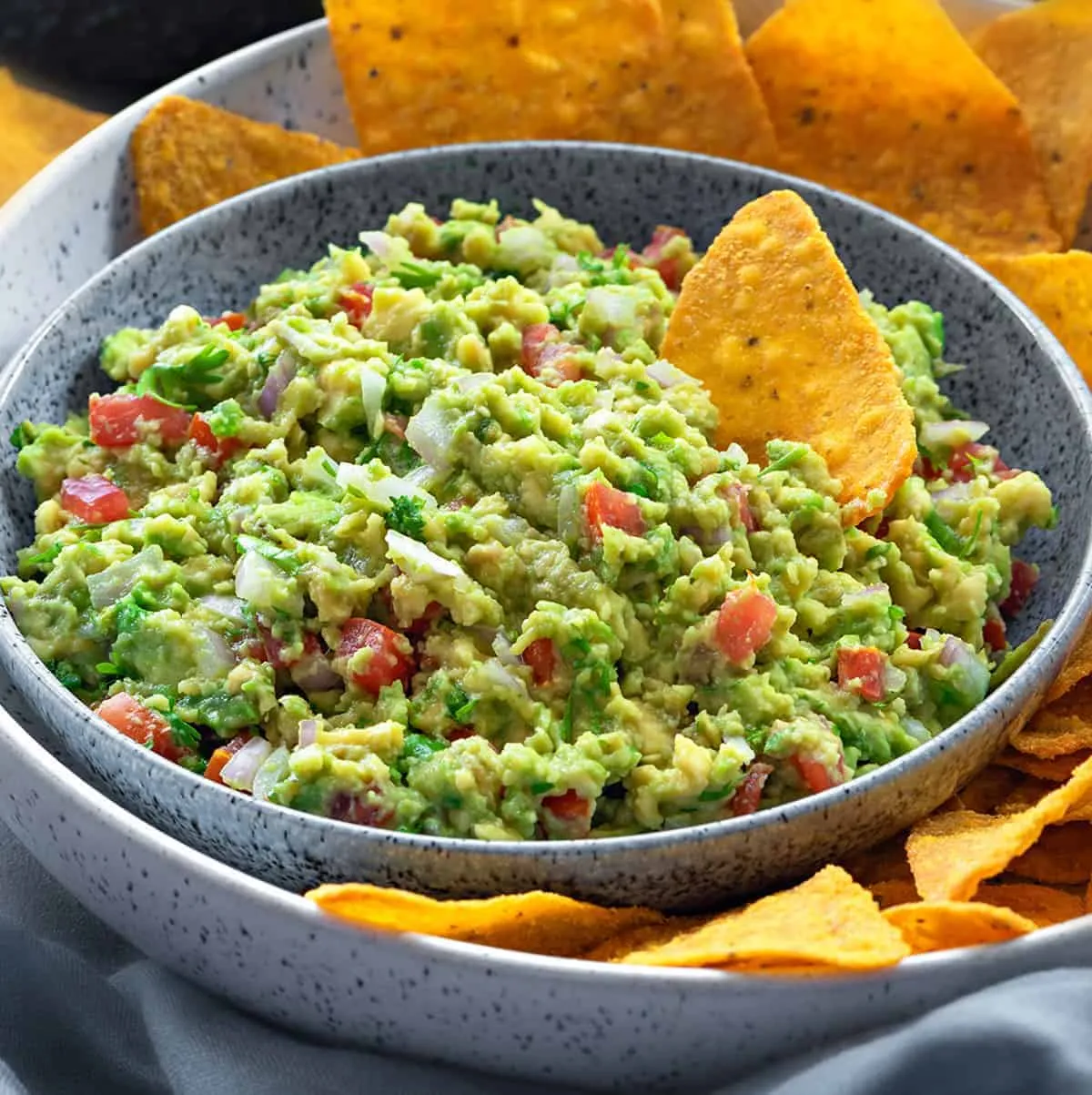 – 3 ripe avocados – 1 lime (juiced) – 1/2 red onion (finely chopped) – 1 tomato (diced) – 1 small garlic clove (minced) – 1 tablespoon cilantro (chopped) – Salt and pepper to taste